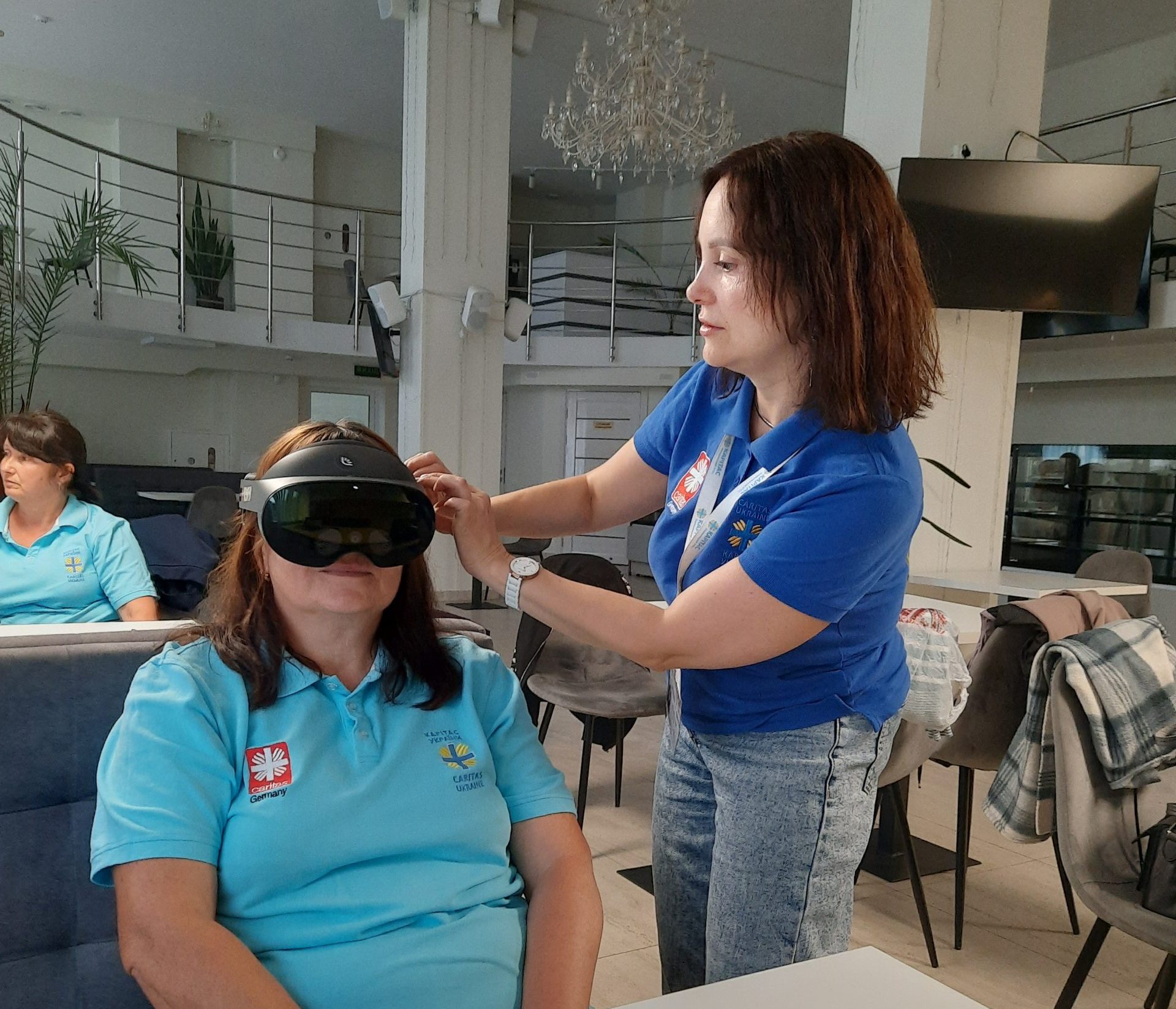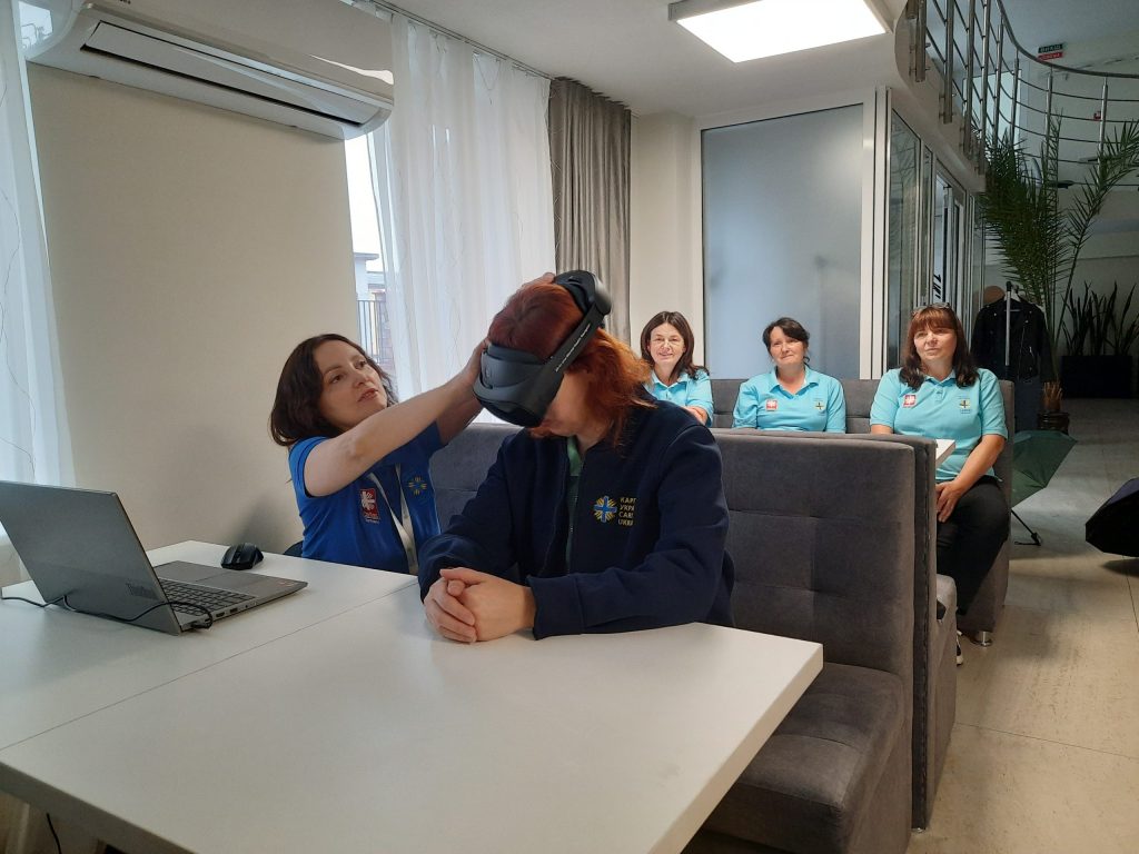 Психологиня проєкту “Домашня опіка” провела заняття для соціальних працівників із використанням VR – окулярів. Соціальні працівники мали змогу відчути спокій, побувати в оточенні природи, відновити внутрішній ресурс та зняти напругу.